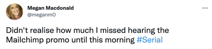 We capitalized on our brand's historical significance with Serial by swiftly identifying the opportunity through social listening. Negotiating for placement in the new episode and Season 1, we strategically managed the placement of an updated "Mailkimp" ad. In less than 24 hours, we reworked, reshot, and aired the ad, recapturing nostalgia and engaging listeners in a meaningful, real-time connection.