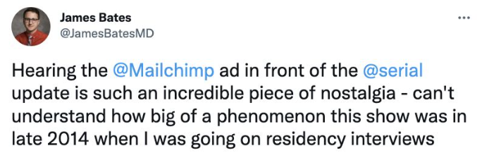 “On the podcast, DiCristina also discusses Mailchimp’s sponsorship of the “Serial” podcast back in 2014. The series covered the true crime case of Adnan Syed, who was released earlier this week from prison, where he had been serving a life sentence. Following Syed’s release, Mailchimp reached out to the New York Times, which now owns “Serial,” and arranged to run its original 2014 Mailchimp ad, tweaked with a customer update, alongside yesterday’s “Serial” episode.”